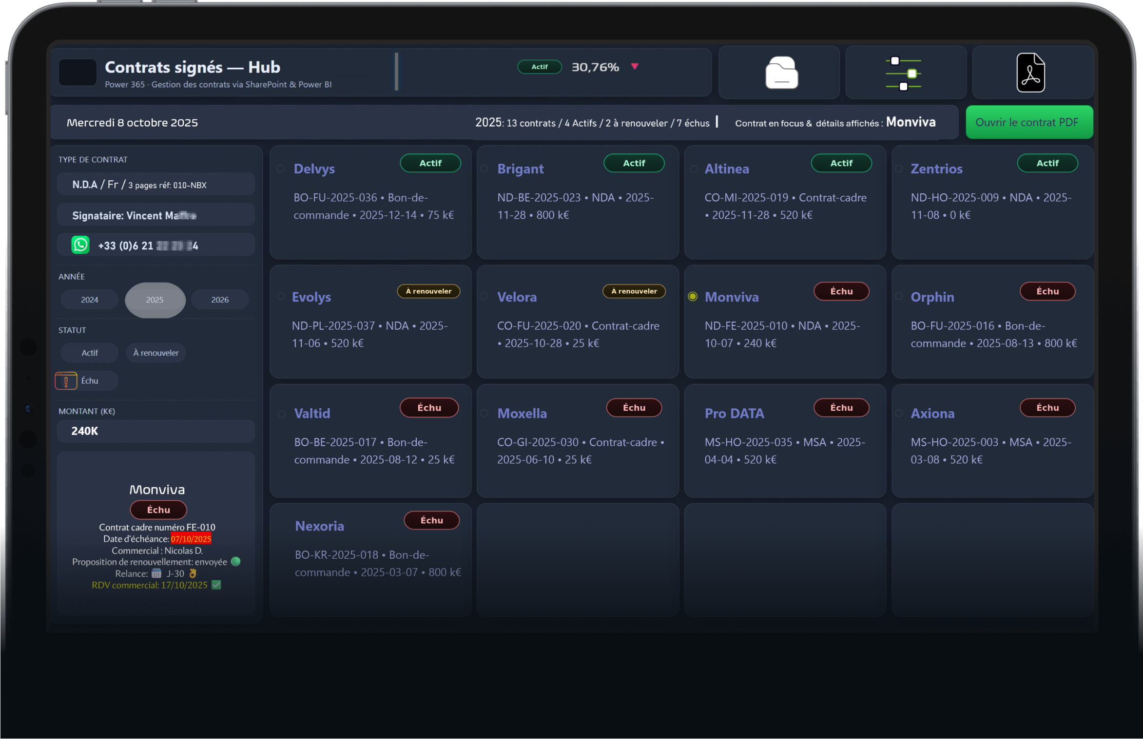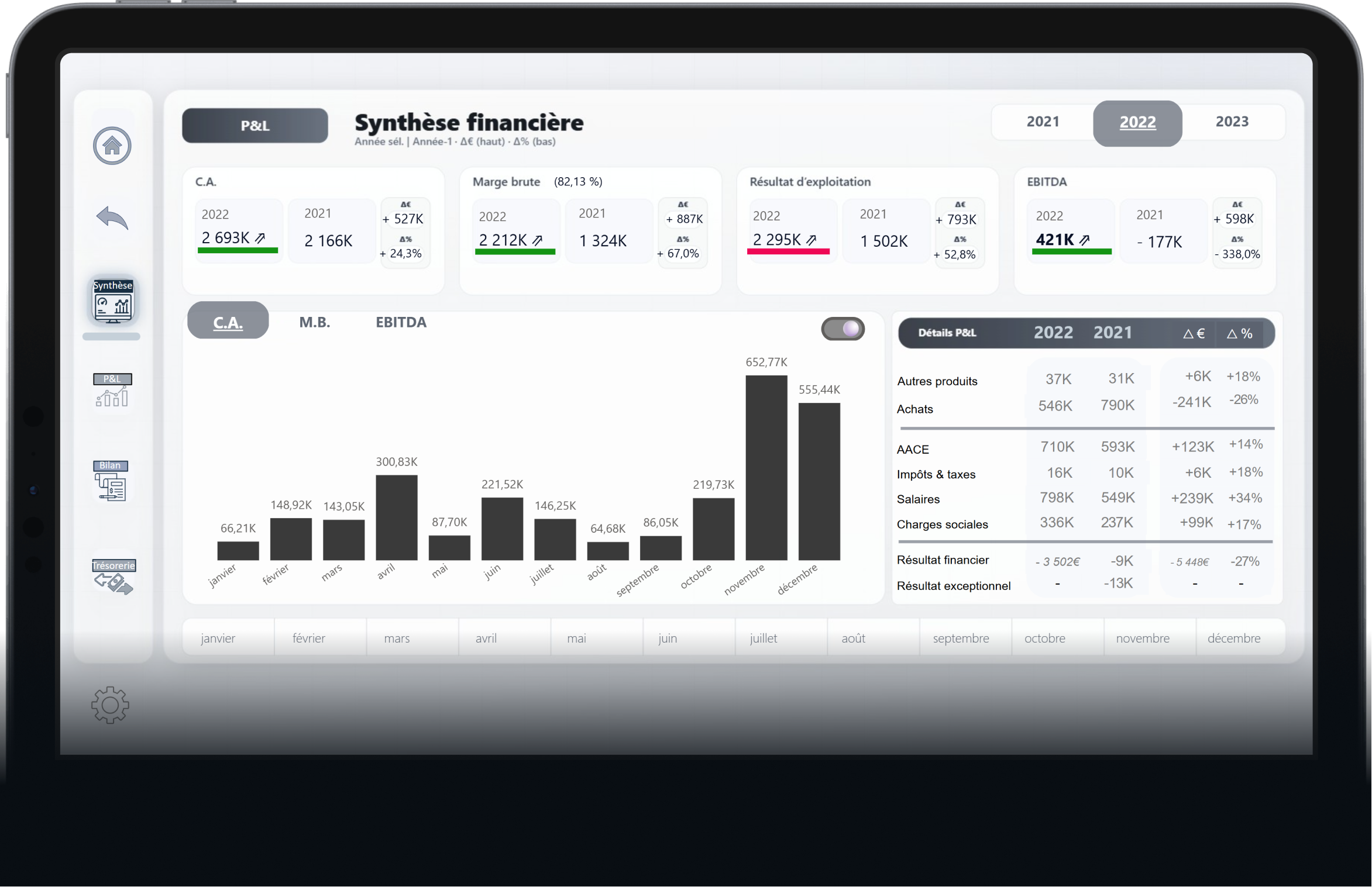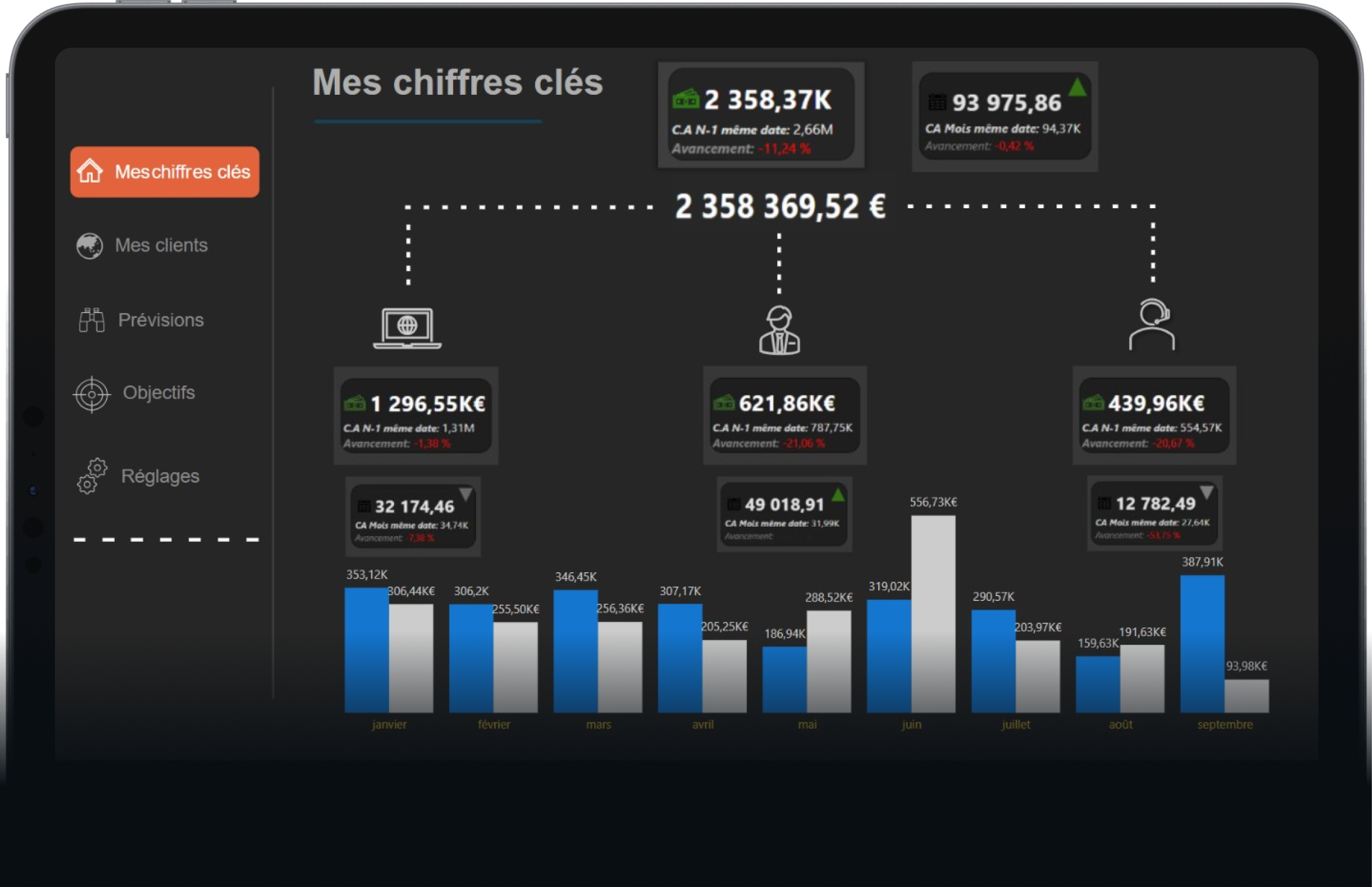 Optimisez vos performances commerciales grâce à l’analyse des données et au suivi des KPI. Nos outils BI vous permettent de piloter votre activité, commerciale, RH, marketing ou autre avec précision.